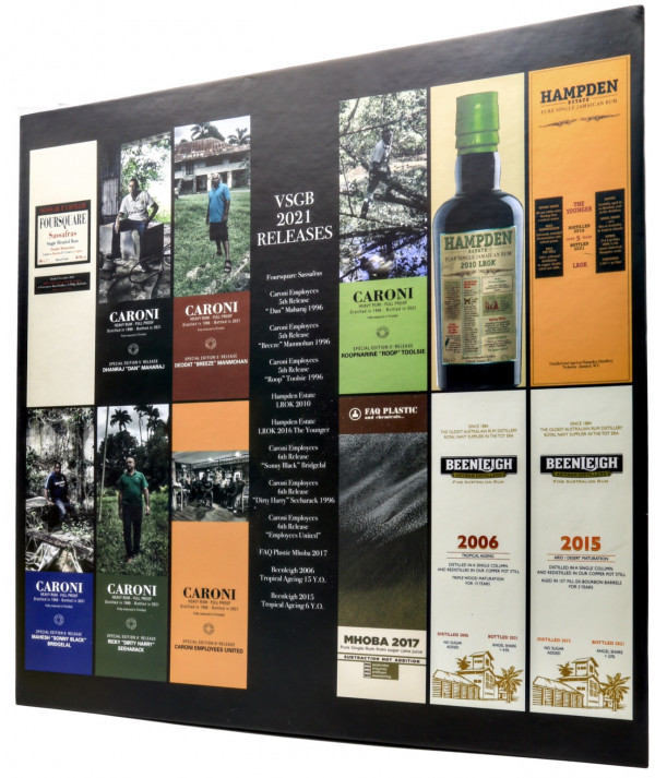 Le coffret réunit plusieurs expressions majeures de l’année 2021, dont Beenleigh 2006, Beenleigh 2015, Mhoba 2017, Hampden LROK The Younger, Hampden LROK 2010 et Foursquare Sassafras. Ces six références couvrent une grande diversité de styles, depuis les rhums australiens de Beenleigh jusqu’aux profils puissants et esters de Hampden, en passant par l’intensité singulière de Mhoba et l’élégance structurée de Foursquare. La présence de six Caroni Employees renforce encore la dimension patrimoniale du coffret, Caroni étant l’une des distilleries fermées les plus mythiques de Trinidad. Ces embouteillages Caroni brut de fût rendent hommage à plusieurs anciens employés de la distillerie, avec des versions full proof dépassant pour certaines les 66%. L’ensemble constitue ainsi une véritable capsule de dégustation, pensée autant pour le collectionneur que pour l’amateur souhaitant comparer des profils rares sans ouvrir des bouteilles grand format. Le format mignonnette permet de préserver l’esprit d’un coffret de découverte tout en conservant une forte valeur de collection.